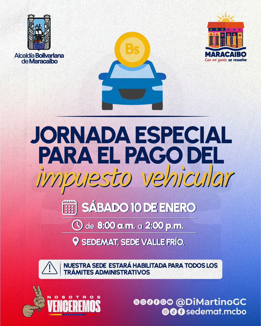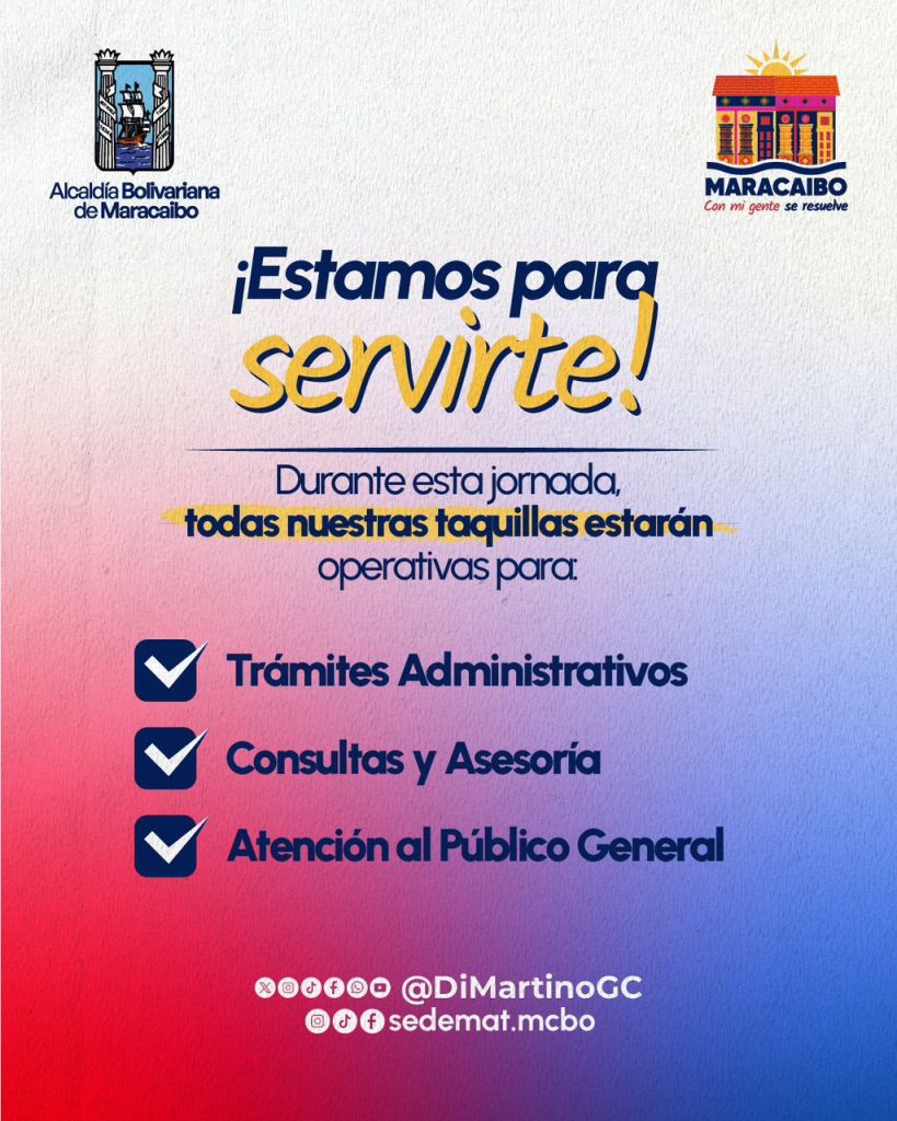 La Alcaldía Bolivariana de Maracaibo, a través del Servicio Desconcentrado Municipal de Administración Tributaria (SEDEMAT), invita a todos los contribuyentes a participar en una jornada especial el sábado 10 de enero, destinada al pago del impuesto sobre vehículos y otros trámites administrativos.
